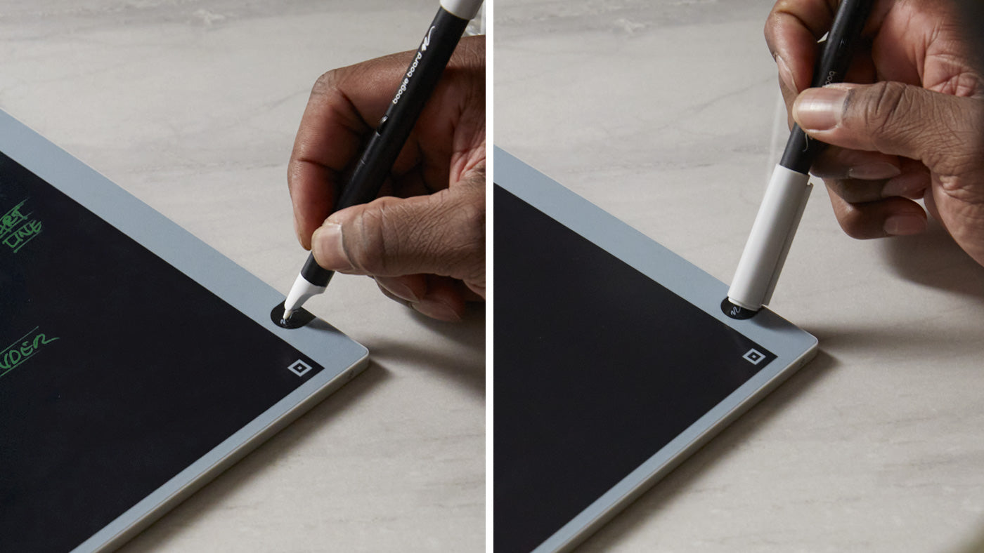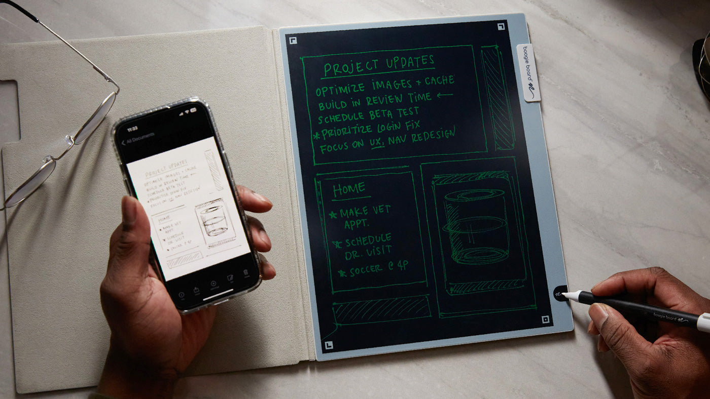 Ditch the countless pages of paper, ink pens, and charging cords, and embrace the reusable smart writing solution that saves notes straight to your smartphone. With just a tap of the Smart Pen to the corner of Blackboard 2.0, your notes are saved (as PDF or JPEG files) and ready to be organized thanks to the free Blackboard by Boogie Board app for iOS and Android. Up your productivity game with Blackboard 2.0 thanks to the app’s integration with Dropbox, Google Drive, Evernote, Slack, and OneNote.
